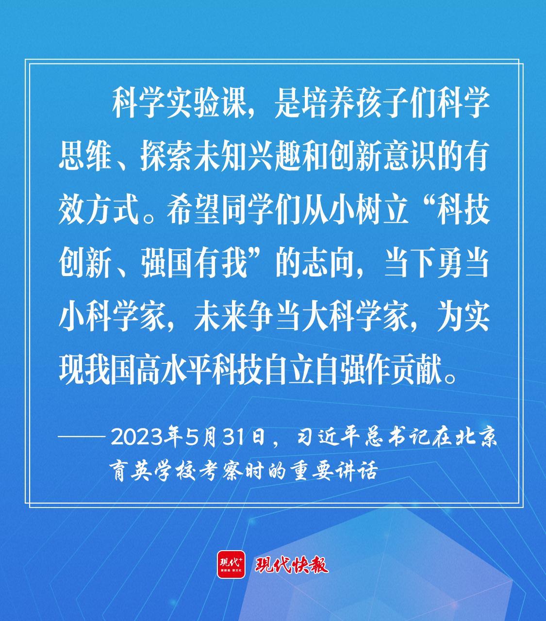 2023年5月,習近平總書記在北京育英學??疾鞎r強調(diào),希望同學們從小樹立“科技創(chuàng)新、強國有我”的志向,當下勇當小科學家,未來爭當大科學家,為實現(xiàn)我國高水平科技自立自強作貢獻。