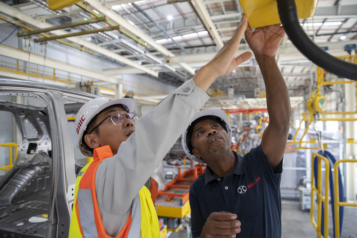 2023年5月9日,在南非東開普省北汽南非工廠,電工邦加尼(右)與中國同事方龍在焊裝車間內(nèi)工作。新華社記者 張譽(yù)東 攝