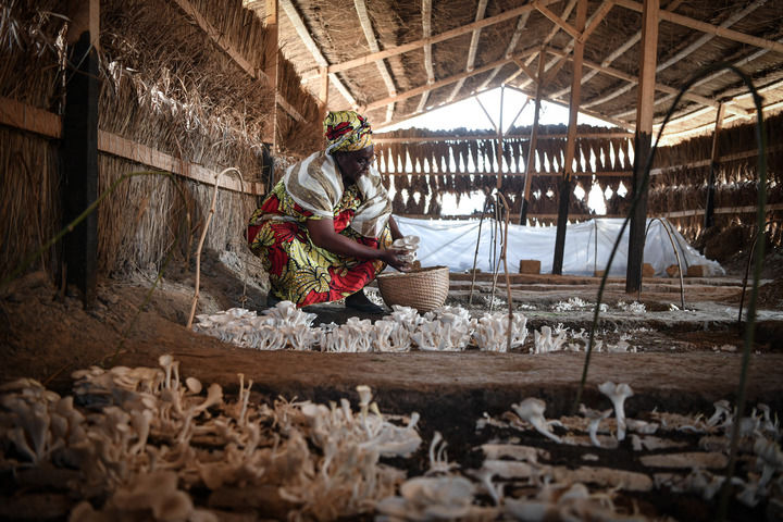 2024年2月6日,在中非共和國達(dá)馬拉,法蒂瑪在菇棚內(nèi)收獲菌草菇。2022年,法蒂瑪在聽說中國菌草專家在班吉傳授技術(shù)后主動前往學(xué)習(xí),從一間小菌棚起步,逐漸擴(kuò)大為如今小有名氣的合作社。 新華社記者 韓旭 攝