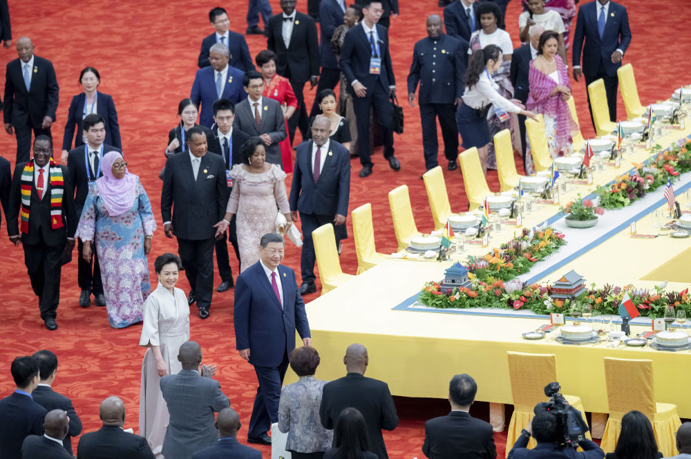 華燈初上,人民大會(huì)堂北大廳燈火輝煌。紅毯鋪就,中國(guó)國(guó)旗和50多面非洲國(guó)家國(guó)旗以及非洲聯(lián)盟旗幟組成的旗陣恢弘大氣、熱烈奔放。