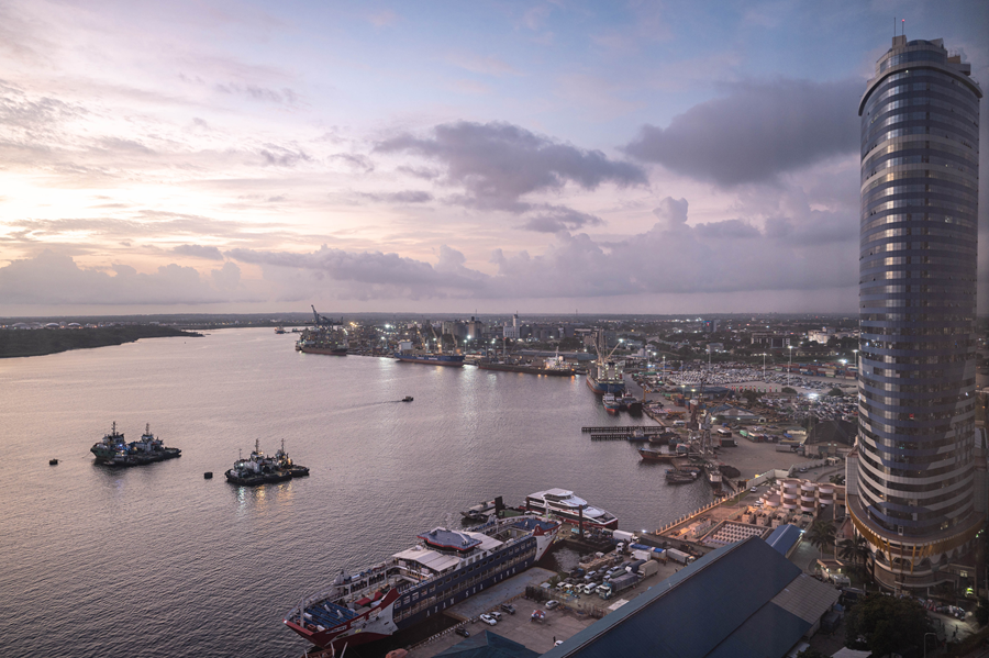這是2023年12月29日拍攝的日出時(shí)分的坦桑尼亞達(dá)累斯薩拉姆港。新華社記者 王冠森 攝