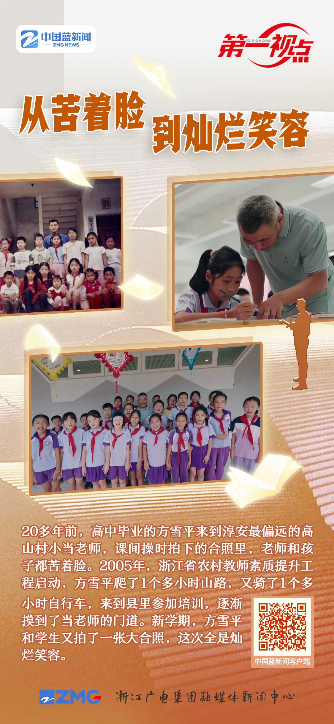 彼時(shí)的浙江,小學(xué)教師的學(xué)歷達(dá)標(biāo)率,在全國(guó)排位倒數(shù)。高中畢業(yè)的農(nóng)村老師方雪平,來(lái)到淳安最偏遠(yuǎn)的高山村小。一個(gè)人,要教兩個(gè)年級(jí)20多個(gè)孩子的全部科目。一次課間操時(shí),村小老師拍下的照片,無(wú)論是老師還是孩子,一個(gè)個(gè)都苦著臉。方雪平說(shuō):“當(dāng)時(shí)(上課時(shí))我心里是很緊張的,緊張到手心冒汗。外出培訓(xùn)的機(jī)會(huì)幾乎是沒(méi)有的,自己慢慢去摸索唄。”