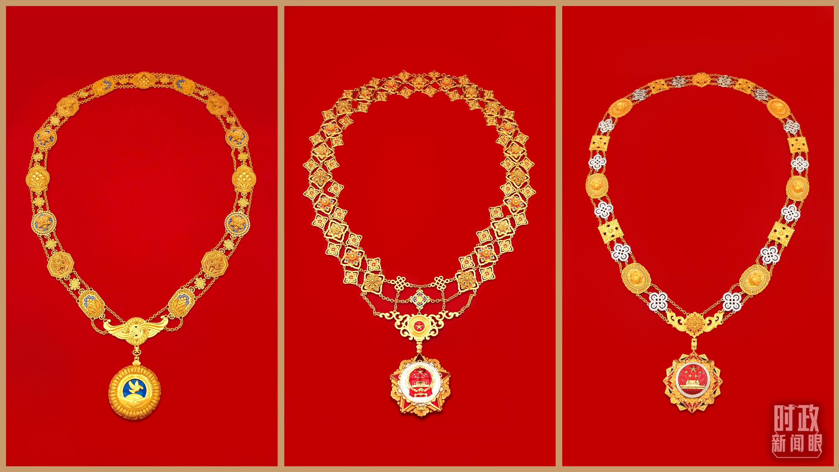 “共和國勛章”(中)、“友誼勛章”(左)和國家榮譽稱號獎?wù)拢ㄓ遥?。(總臺央視記者郭鴻、鄂介甫拍攝)