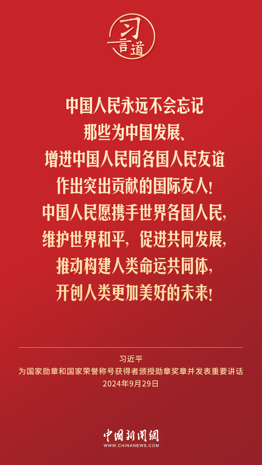 經(jīng)中共中央批準(zhǔn),中華人民共和國國家勛章和國家榮譽稱號頒授儀式于9月29日上午10時在人民大會堂隆重舉行。中共中央總書記、國家主席、中央軍委主席習(xí)近平向國家勛章和國家榮譽稱號獲得者分別授予“共和國勛章”“友誼勛章”和國家榮譽稱號獎?wù)虏l(fā)表重要講話。習(xí)近平指出——