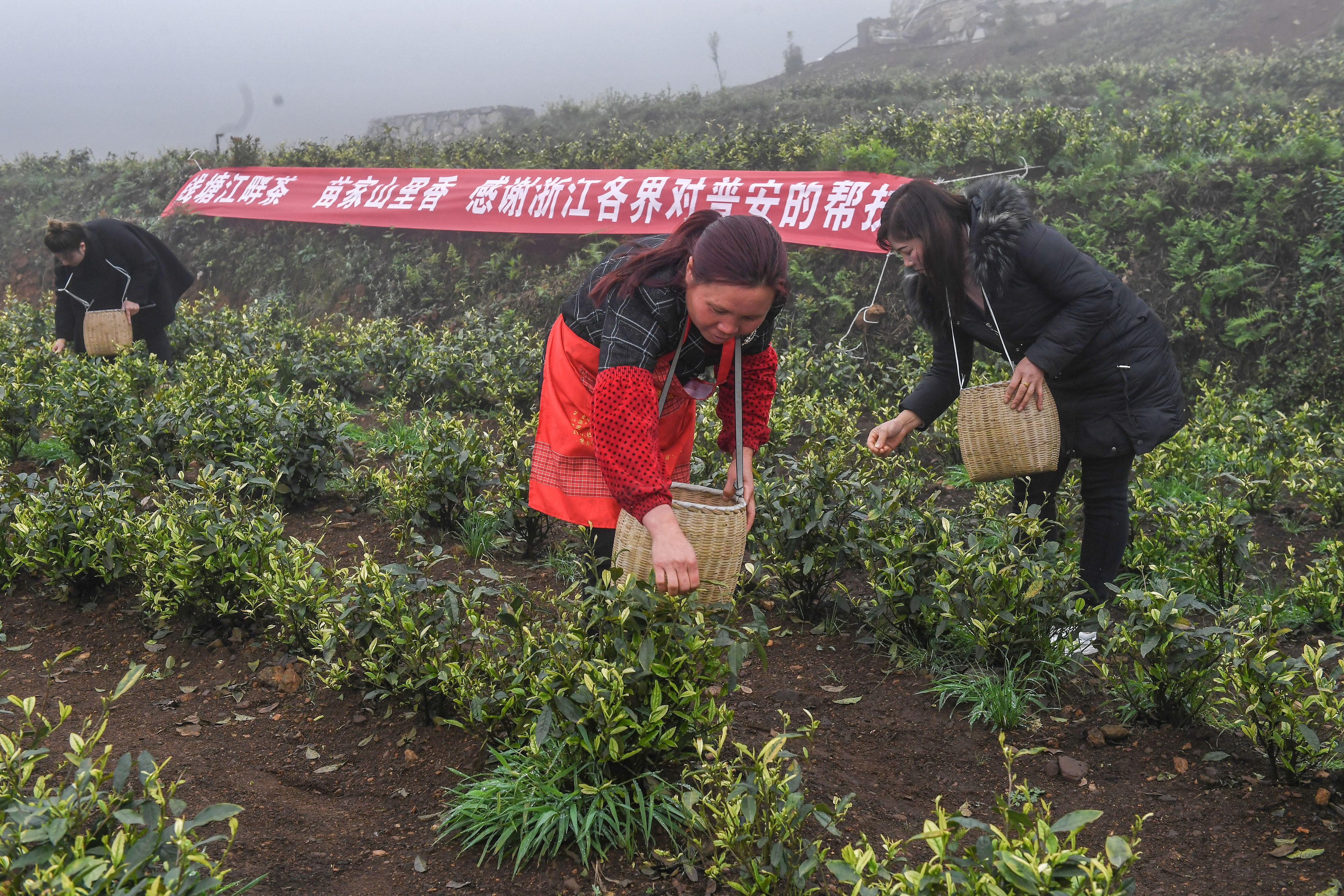 2021年4月14日,工人在貴州省黔西南州普安縣地瓜鎮(zhèn)屯上村“白葉一號(hào)”感恩茶園采茶。這片茶園由浙江省安吉縣捐贈(zèng)。