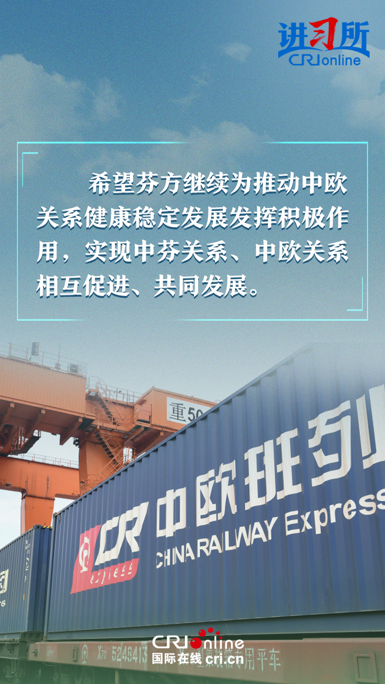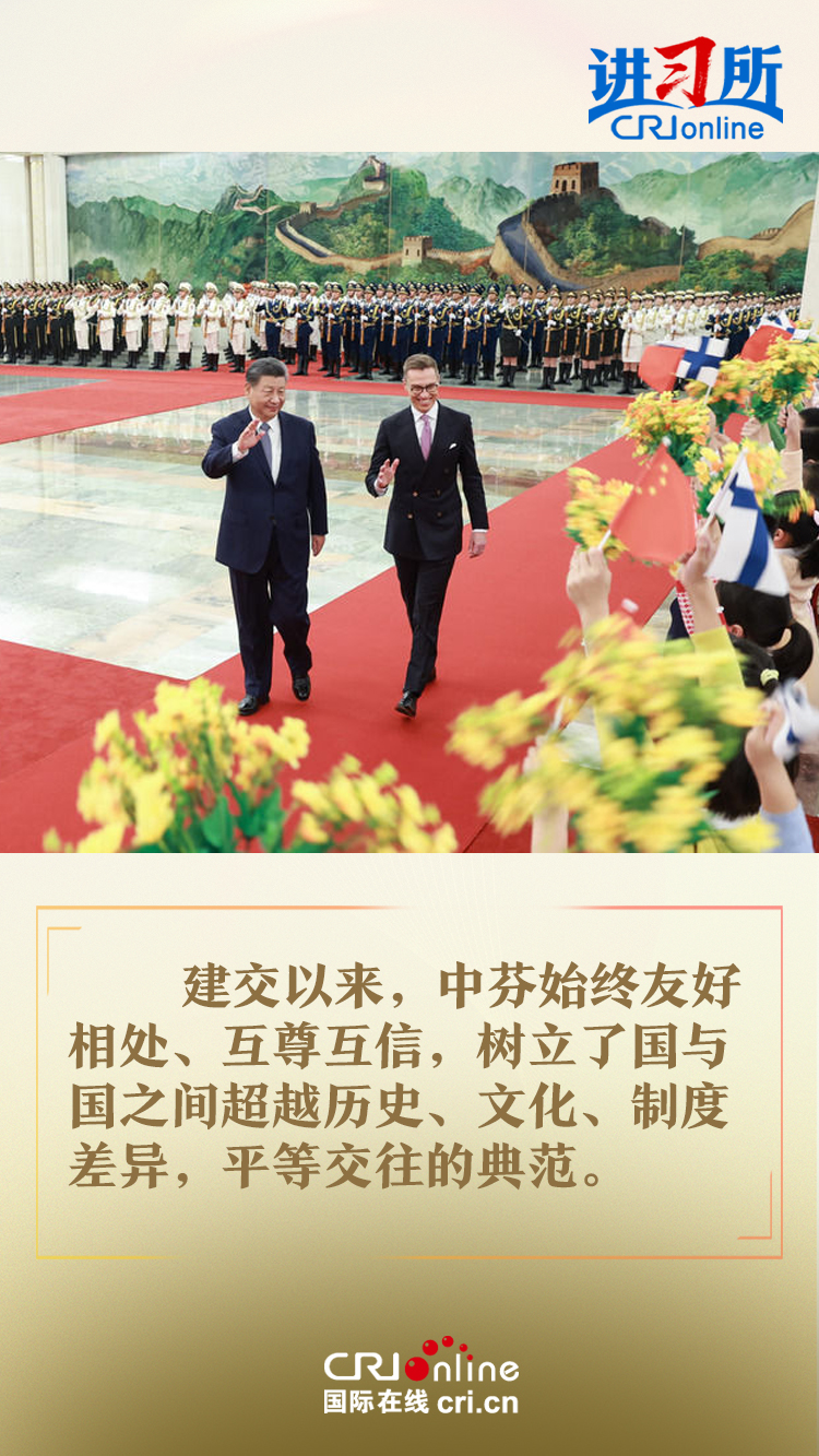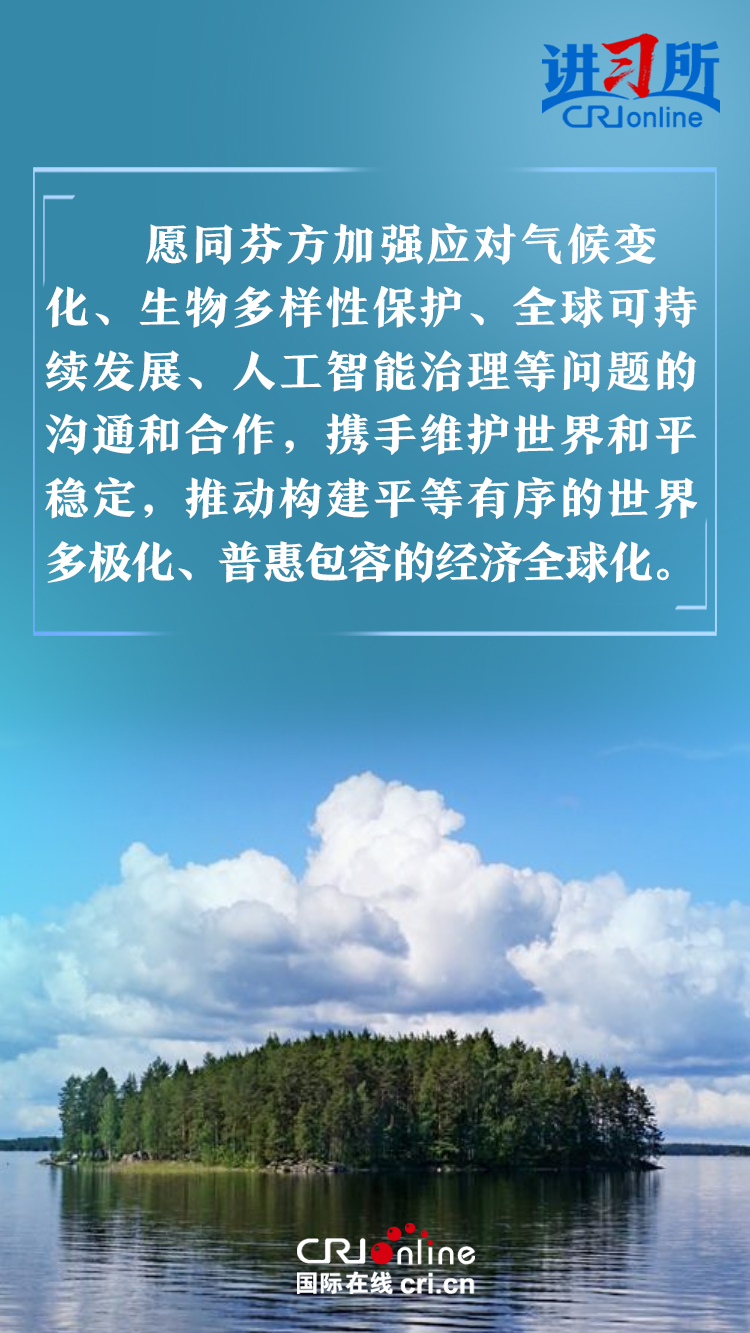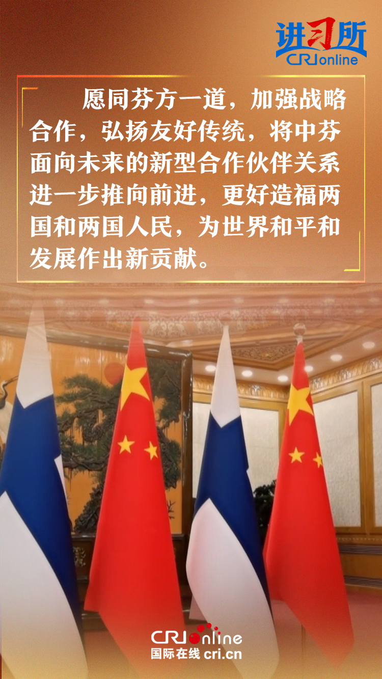 習(xí)近平指出,建交以來,中芬始終友好相處、互尊互信,樹立了國(guó)與國(guó)之間超越歷史、文化、制度差異,平等交往的典范。中方愿同芬方一道,加強(qiáng)戰(zhàn)略合作,弘揚(yáng)友好傳統(tǒng),將中芬面向未來的新型合作伙伴關(guān)系進(jìn)一步推向前進(jìn),更好造福兩國(guó)和兩國(guó)人民,為世界和平和發(fā)展作出新貢獻(xiàn)。