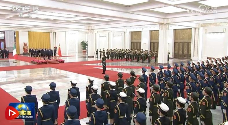 天安門廣場(chǎng)鳴放21響禮炮,禮兵列隊(duì)致敬。兩國(guó)元首登上檢閱臺(tái),軍樂(lè)團(tuán)奏中意兩國(guó)國(guó)歌。馬塔雷拉在習(xí)近平陪同下檢閱中國(guó)人民解放軍儀仗隊(duì),并觀看分列式。