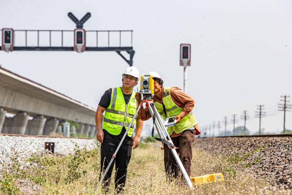 5月1日,在泰國大城府,中泰高鐵項目工作人員在施工現(xiàn)場勘查。新華社記者王騰攝