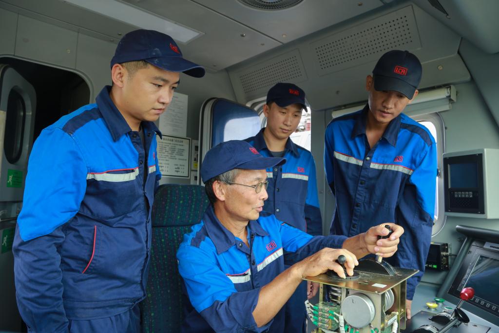 在中老鐵路萬象運營管理中心的機車檢修庫里,中老師徒4人一同對機車部件進行攻關(guān)(2024年9月9日攝)。新華社發(fā)(鄭皓文攝)