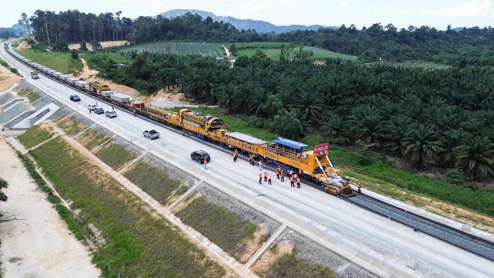 這是5月6日在馬來西亞彭亨州航拍的馬東鐵項目的鋪軌現(xiàn)場。新華社記者程一恒攝