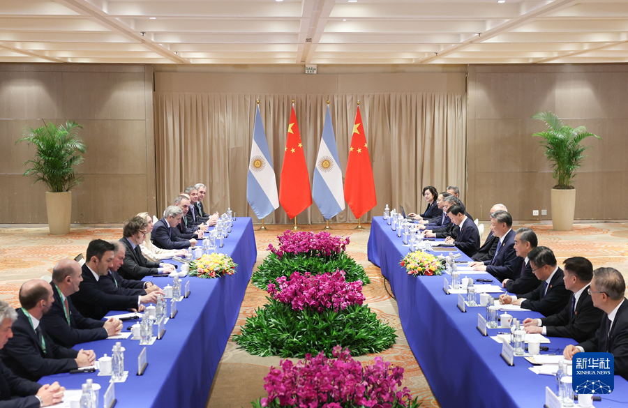當(dāng)?shù)貢r間11月19日上午,國家主席習(xí)近平在里約熱內(nèi)盧出席二十國集團(tuán)領(lǐng)導(dǎo)人峰會期間會見阿根廷總統(tǒng)米萊。新華社記者 丁海濤 攝