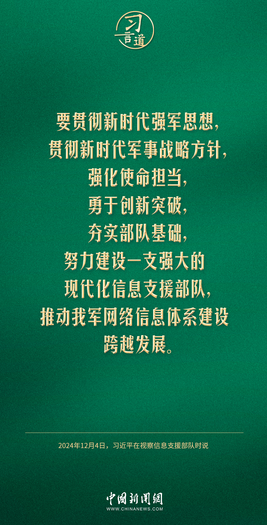 中共中央總書記、國(guó)家主席、中央軍委主席習(xí)近平4日視察信息支援部隊(duì),代表黨中央和中央軍委,對(duì)信息支援部隊(duì)第一次黨代表大會(huì)的召開表示熱烈祝賀,向信息支援部隊(duì)全體官兵致以誠(chéng)摯問候。習(xí)近平指出——