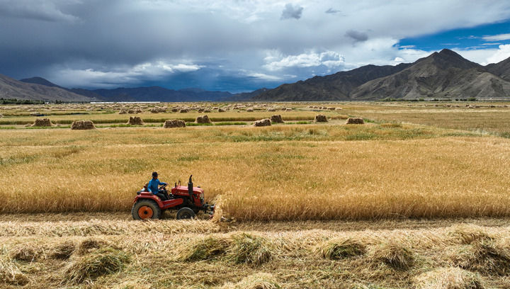 2024年9月10日在西藏日喀則市白朗縣巴扎鄉(xiāng)拍攝的秋收?qǐng)鼍埃o(wú)人機(jī)照片)。新華社記者 晉美多吉 攝
