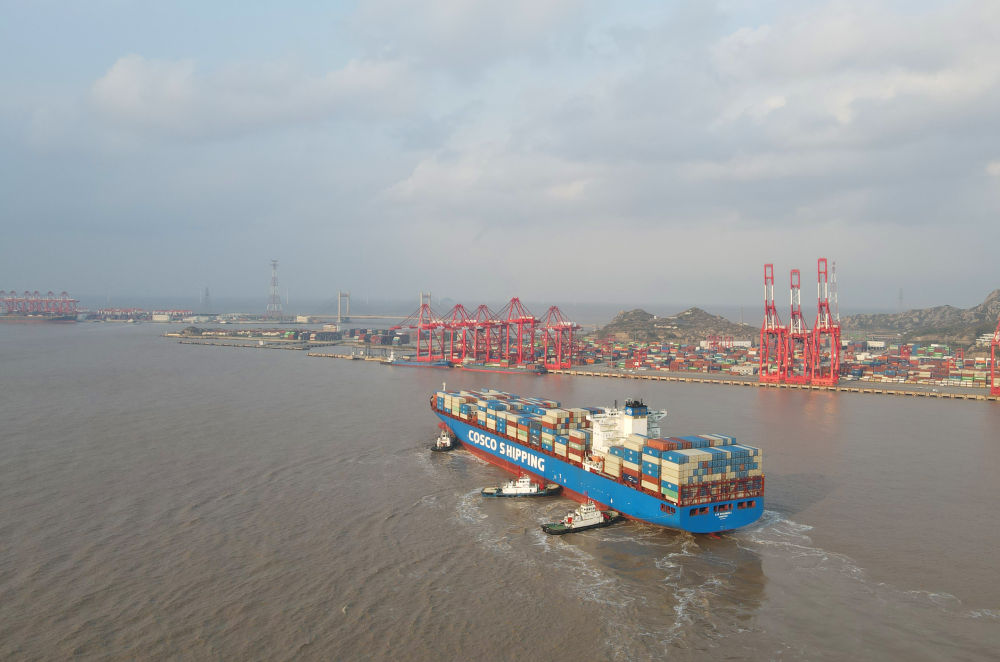 “新上海”輪抵達洋山港,這是自秘魯錢凱港開港后首個“錢凱—上?!闭胶酱危?024年12月18日攝,無人機照片)。新華社記者 方喆 攝
