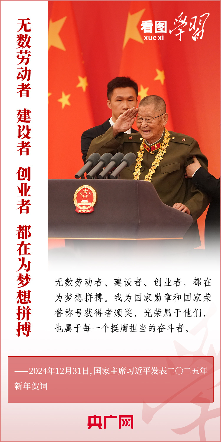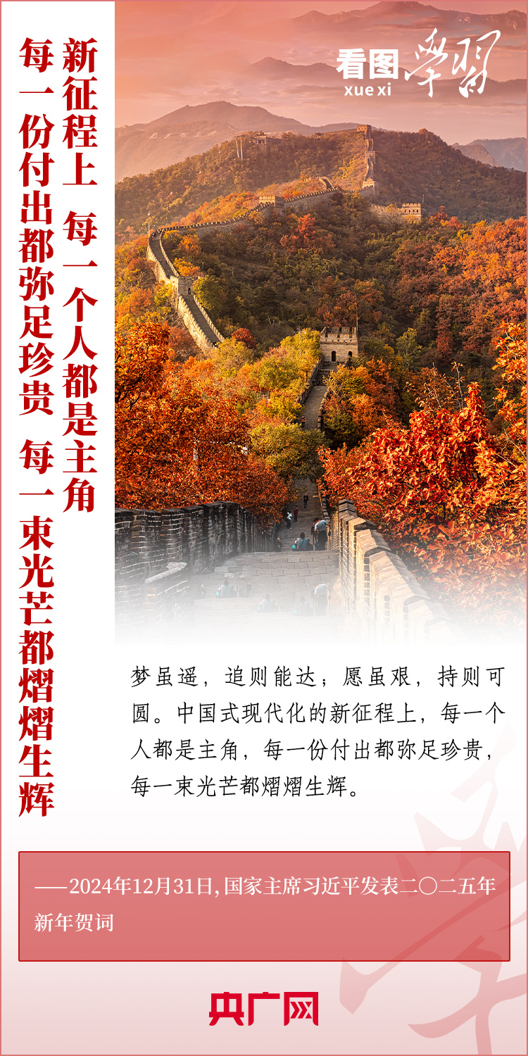 “夢(mèng)雖遙,追則能達(dá);愿雖艱,持則可圓?!毙履昵跋?,習(xí)近平主席發(fā)表二〇二五年新年賀詞。在溫暖有力的講述中,習(xí)主席深情回望過去一年中國(guó)不平凡的奮斗歷程、精彩瞬間,感慨大家一道經(jīng)歷的風(fēng)雨彩虹、難忘時(shí)刻,贊美無數(shù)為夢(mèng)想拼搏的勞動(dòng)者、建設(shè)者、創(chuàng)業(yè)者。習(xí)主席說,中國(guó)式現(xiàn)代化的新征程上,每一個(gè)人都是主角,每一份付出都彌足珍貴,每一束光芒都熠熠生輝。讓我們充滿信心,在新的一年接續(xù)奮斗!