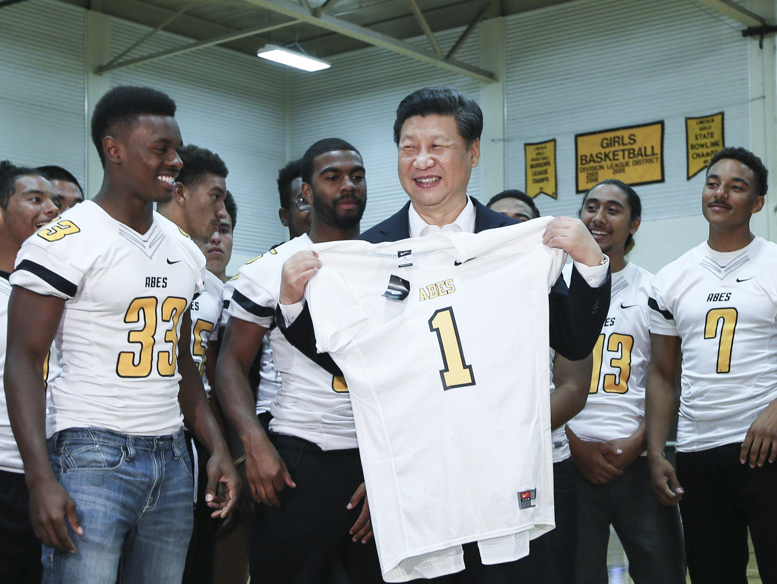 當(dāng)?shù)貢r(shí)間2015年9月23日,習(xí)近平主席參觀美國(guó)塔科馬市林肯中學(xué)。圖為習(xí)主席接受學(xué)生們贈(zèng)送橄欖球衣。