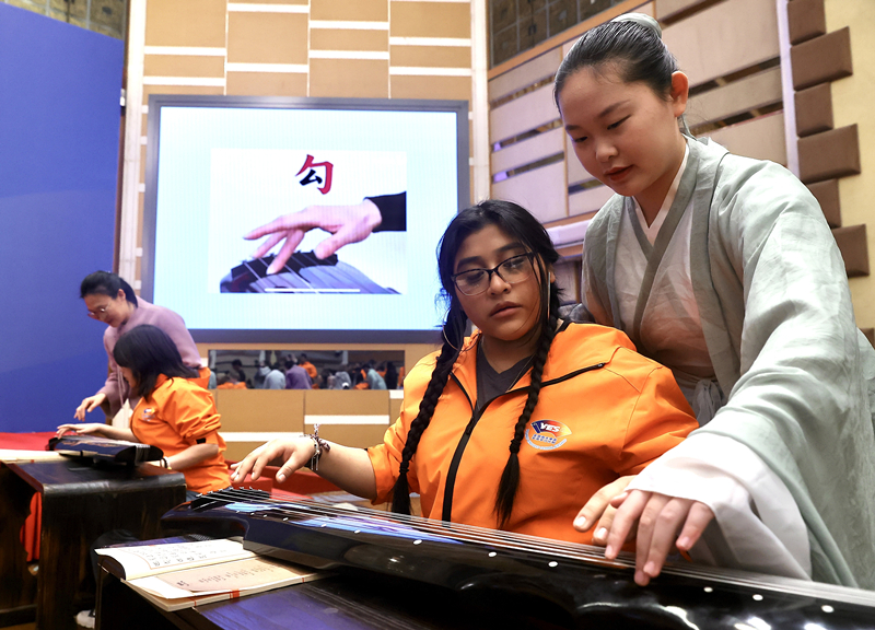 2024年3月20日,美國(guó)華盛頓州中學(xué)生代表團(tuán)北京大學(xué)交流活動(dòng)在北京大學(xué)英杰交流中心舉行。圖為來自華盛頓州的中學(xué)生體驗(yàn)古琴。
