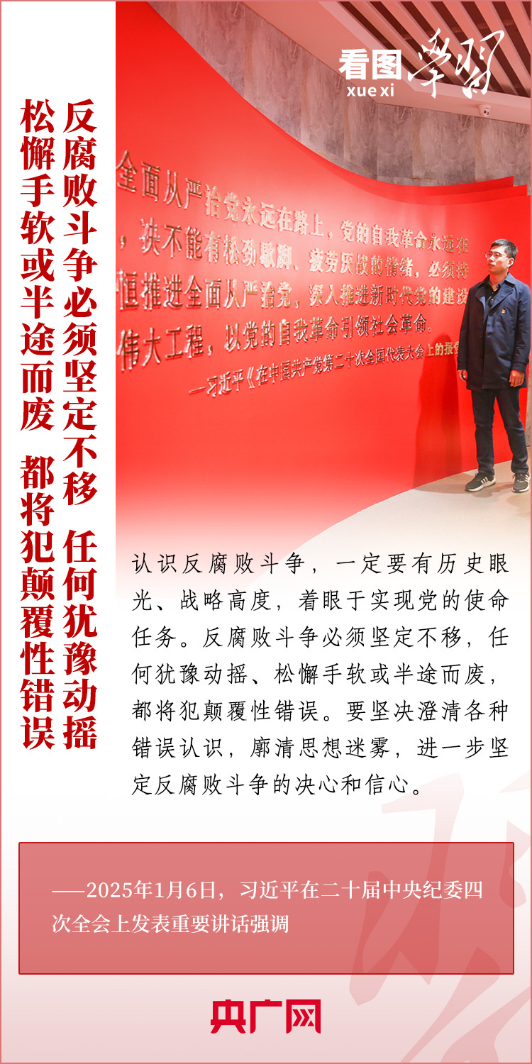 1月6日,習近平總書記在二十屆中央紀委四次全會上發(fā)表重要講話,充分肯定過去一年全面從嚴治黨取得的新進展、新成效,深刻分析當前反腐敗斗爭形勢,對堅決打好反腐敗斗爭攻堅戰(zhàn)、持久戰(zhàn)、總體戰(zhàn)提出明確要求??倳洀娬{(diào),新時代新征程,必須堅持用改革精神和嚴的標準管黨治黨,努力取得更大成效,確保黨的二十大和二十屆三中全會部署落地落實,確保黨始終成為中國特色社會主義事業(yè)的堅強領(lǐng)導核心,推動中國式現(xiàn)代化行穩(wěn)致遠。一起來學習!