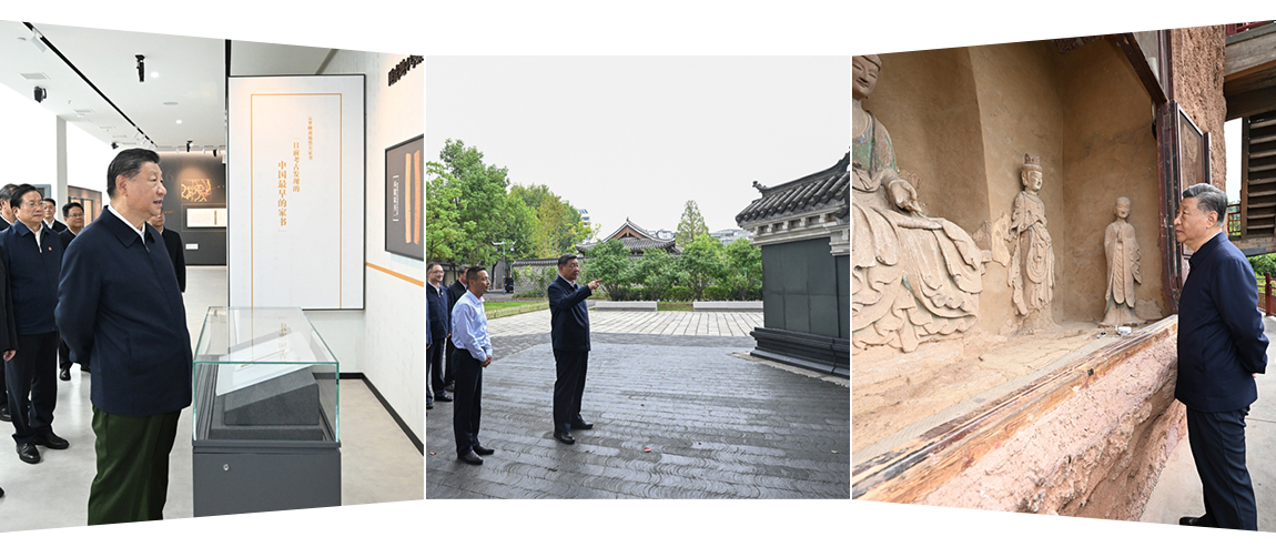 自左向右分別為:2024年11月4日,習近平總書記在湖北孝感云夢縣博物館參觀出土秦漢簡牘展;2024年10月17日,習近平總書記在安徽桐城六尺巷考察;2024年9月11日,習近平總書記在甘肅天水麥積山石窟考察。