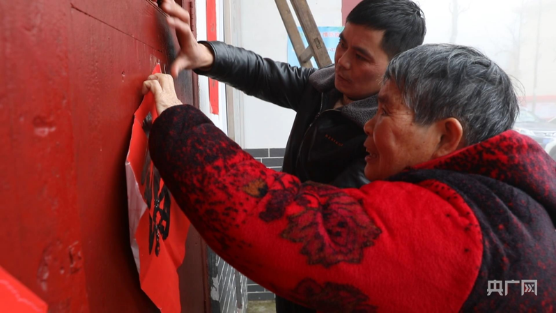 彭德良與70多歲母親貼春聯(lián)(央廣網(wǎng)記者 郇康新 攝)