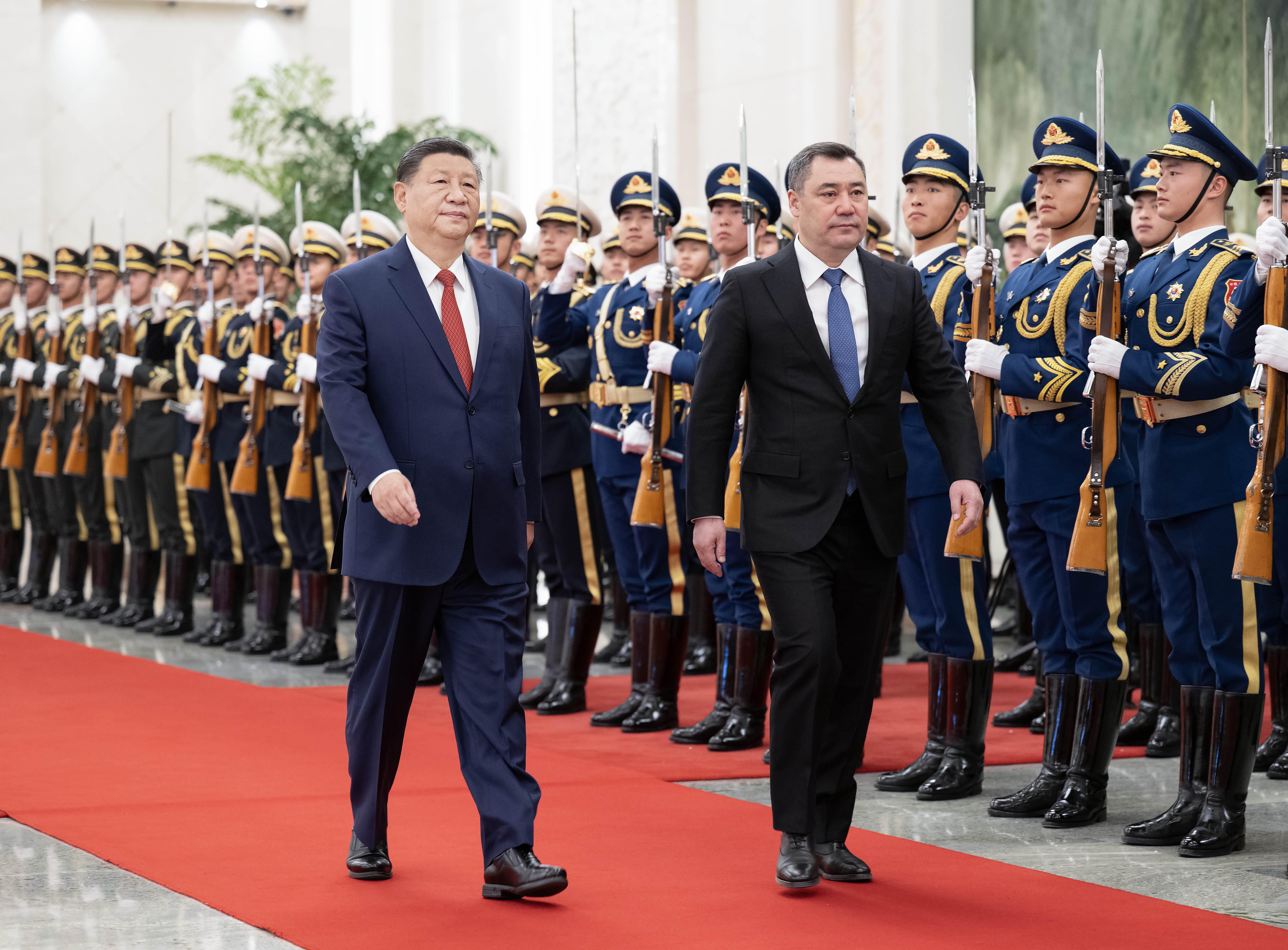 天安門廣場鳴放21響禮炮,禮兵列隊(duì)致敬。兩國元首登上檢閱臺,軍樂團(tuán)奏中吉兩國國歌。扎帕羅夫在習(xí)近平陪同下檢閱中國人民解放軍儀仗隊(duì),并觀看分列式。