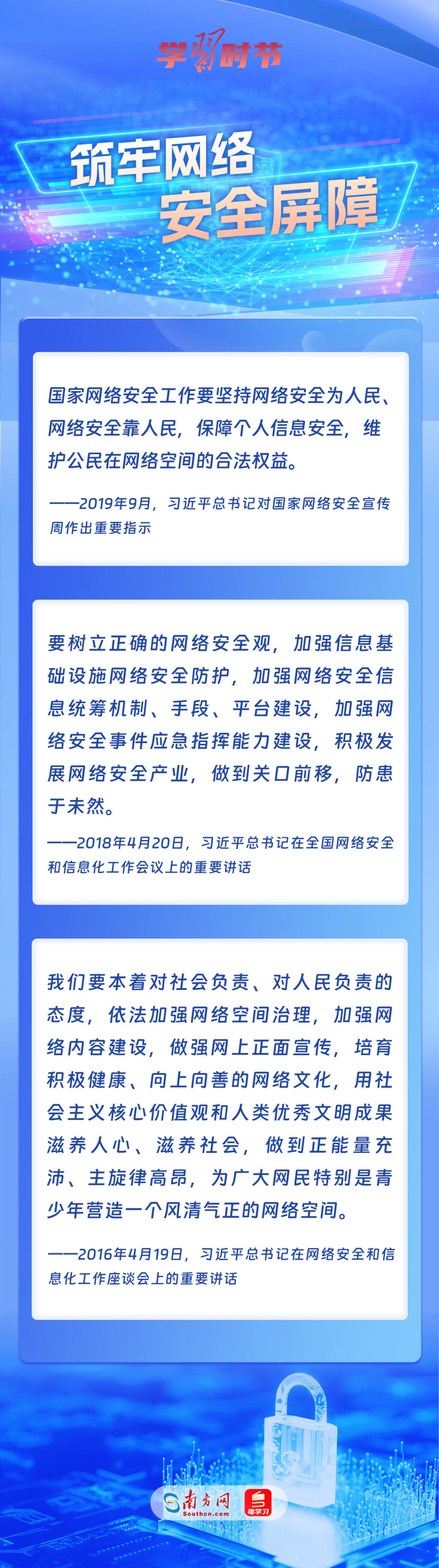 黨的十八大以來,習近平總書記從信息化發(fā)展大勢和國內(nèi)國際大局出發(fā),就網(wǎng)絡安全和信息化工作提出一系列具有開創(chuàng)性意義的新理念新思想新戰(zhàn)略,形成了習近平總書記關于網(wǎng)絡強國的重要思想。其中,有不少生動形象的表述,深入人心,發(fā)人深省,讓我們一起學習。
