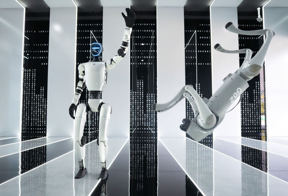 2025年3月1日,在杭州宇樹科技有限公司的產(chǎn)品展示中心,人形機(jī)器人和四足機(jī)器人在工作人員控制下做動(dòng)作。人形機(jī)器人是人工智能技術(shù)的集成體現(xiàn),在這個(gè)未來產(chǎn)業(yè)的重要賽道上,一大批中國企業(yè)深耕技術(shù)、持續(xù)創(chuàng)新,國產(chǎn)機(jī)器人正在跑出“加速度”。