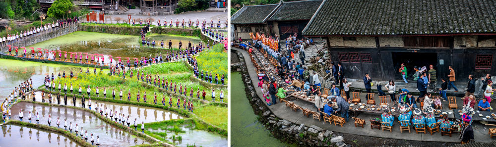 左圖:近期,人們在黎平縣肇興侗寨的田園里演唱侗族大歌(黎平縣委宣傳部供圖);右圖:這是2023年拍攝的十八洞村長桌宴(湘西州委宣傳部供圖)。
