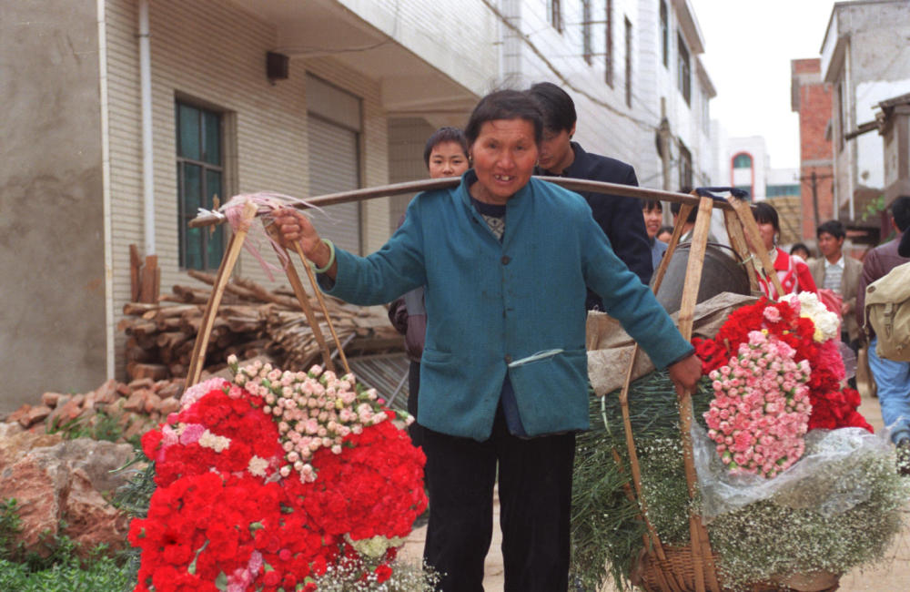 云南省昆明市呈貢龍街鄉(xiāng)斗南村是中國(guó)有名的“花鄉(xiāng)”,全村幾乎家家種花。這是一位當(dāng)?shù)鼗ㄞr(nóng)挑著一擔(dān)鮮花去花卉交易市場(chǎng)出售(1999年6月2日發(fā))。
