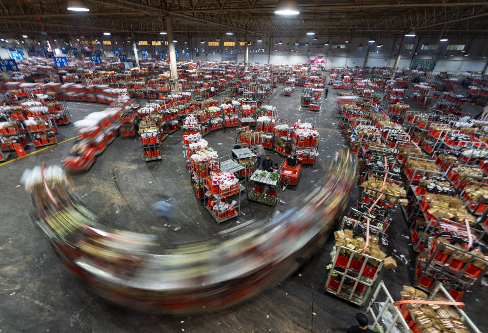 2022年11月11日,工作人員在昆明斗南花市給鮮花貼標(biāo)簽??爝f物流時(shí)效不斷優(yōu)化、冷鏈運(yùn)輸技術(shù)持續(xù)提升,也為中國(guó)鮮花加速“出?!北q{護(hù)航。