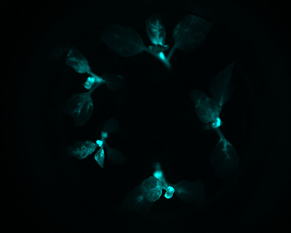 這是云南某農(nóng)業(yè)研發(fā)團(tuán)隊(duì)利用基因技術(shù)成功培育出肉眼可見(jiàn)的“自發(fā)光植物”在黑暗條件下發(fā)光(2017年6月21日攝)。