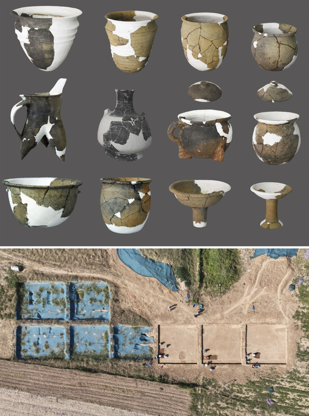 拼版照片:上圖為位于河南南陽方城縣的八里橋遺址出土的陶器(河南省文物考古研究院供圖);下圖為八里橋遺址發(fā)掘現(xiàn)場(無人機(jī)照片,新華社記者袁月明2024年9月11日攝)。八里橋遺址是豫南地區(qū)已發(fā)現(xiàn)規(guī)模最大、等級最高的二里頭文化聚落,為探索夏文化地方城邑聚落形態(tài)、社會結(jié)構(gòu)提供了新線索。