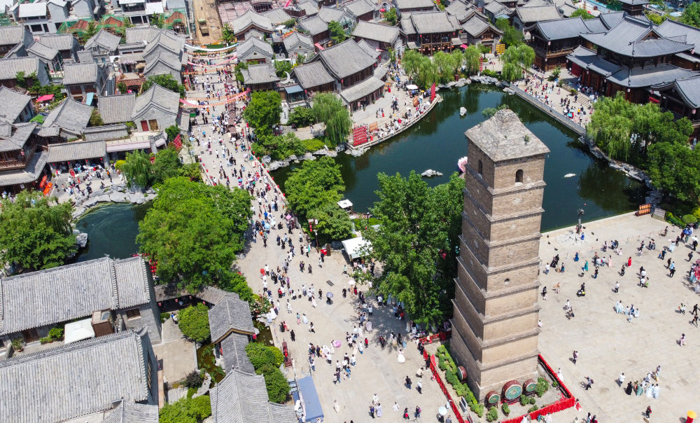 這是位于河南洛陽的洛邑古城景區(qū)(2023年5月2日攝,無人機(jī)照片)。洛邑古城里精致的布景、各色表演和漢服妝造拍攝吸引大量游客前來。