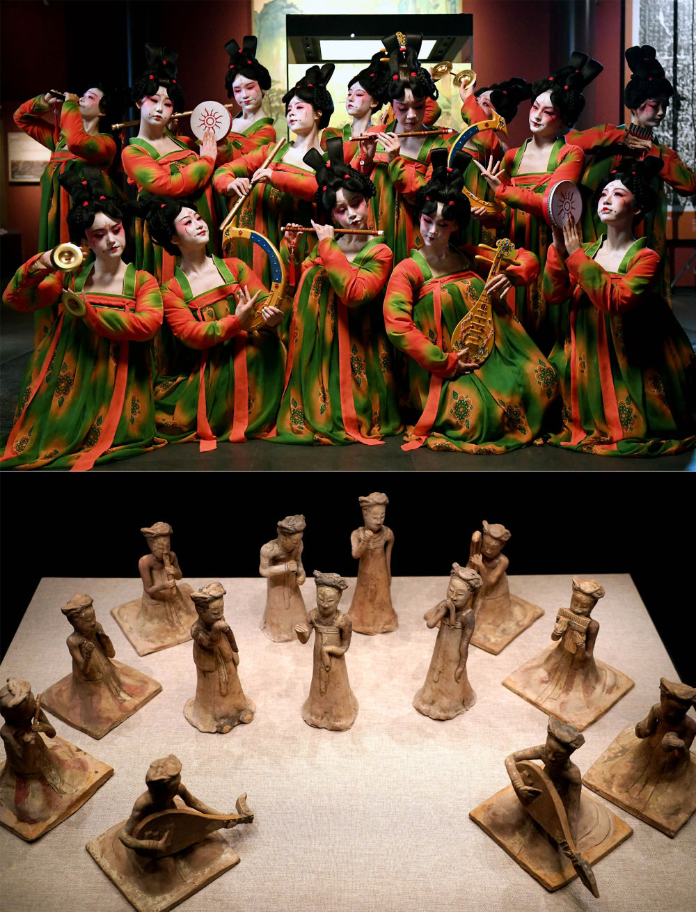 拼版照片:上圖為鄭州歌舞劇院的演員在錄制河南博物院元宵奇妙夜節(jié)目(2021年2月20日攝);下圖為河南博物院主展館內(nèi)展出的展品(2020年9月24日攝)。