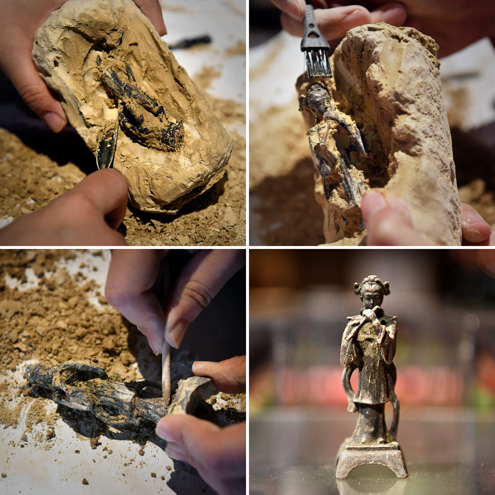這是河南博物院推出的“考古盲盒”的“挖寶”過程(拼版照片,2022年5月17日攝)。