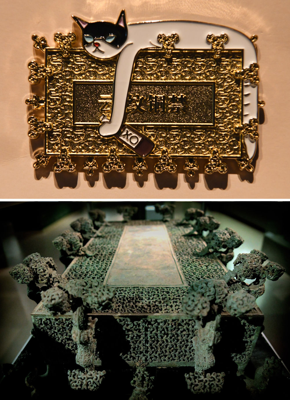 拼版照片:上圖為河南博物院推出的“云紋銅禁”冰箱貼(2022年5月17日攝);下圖為河南博物院展出的展品“云紋銅禁”(2019年11月18日攝)。