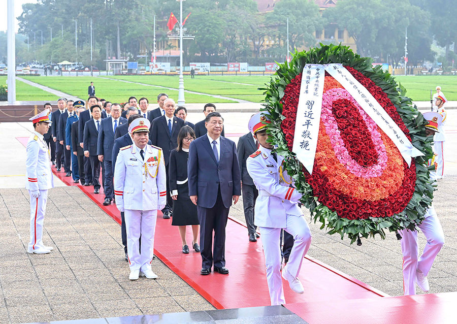 2023年,習近平總書記在訪越期間來到巴亭廣場,沿著載有無數(shù)歷史印記的石板路,前往胡志明陵敬獻花圈,追思緬懷。