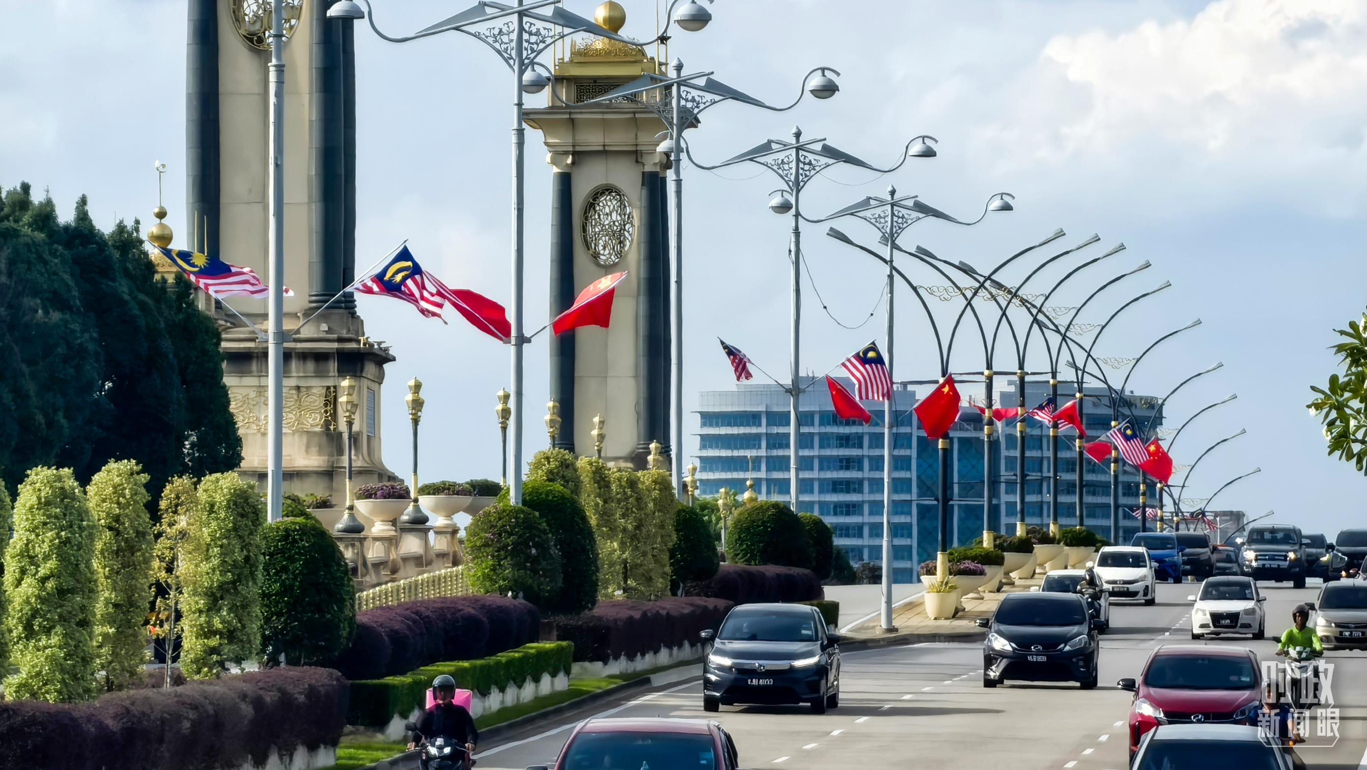 布特拉加亞街頭,中馬兩國(guó)國(guó)旗迎風(fēng)飄揚(yáng)。(總臺(tái)央視記者劉岳拍攝)