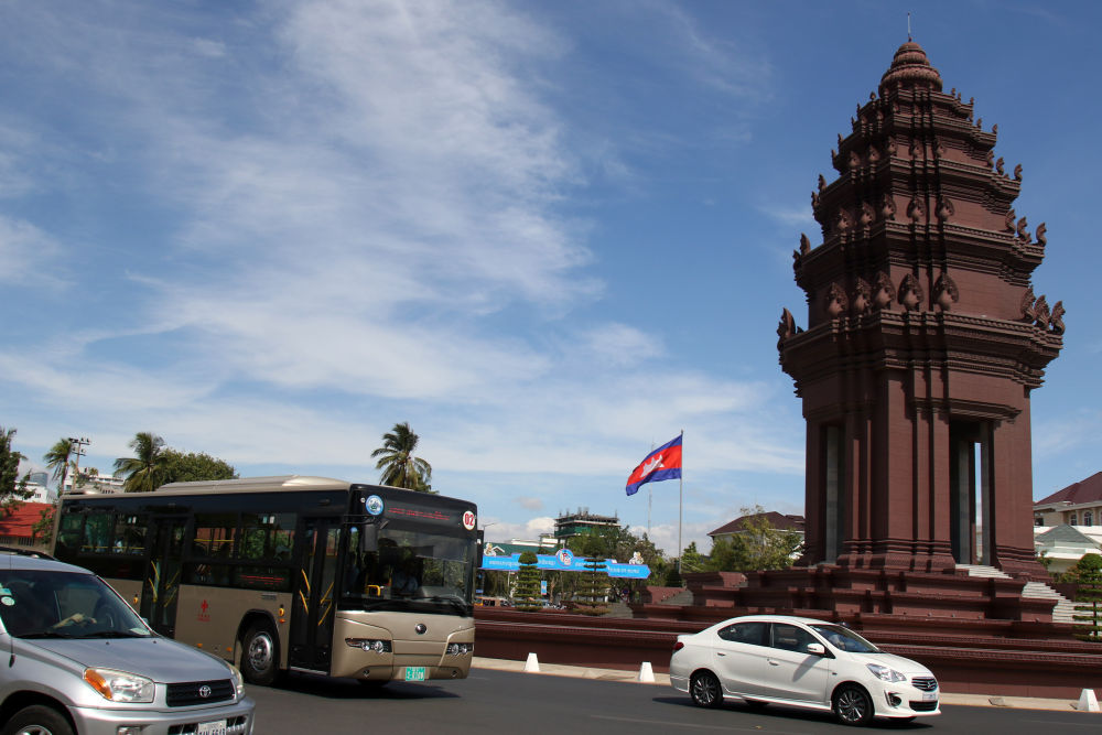 2018年1月5日,在柬埔寨金邊,一輛中國(guó)援助的“宇通”公交車經(jīng)過(guò)獨(dú)立紀(jì)念碑。