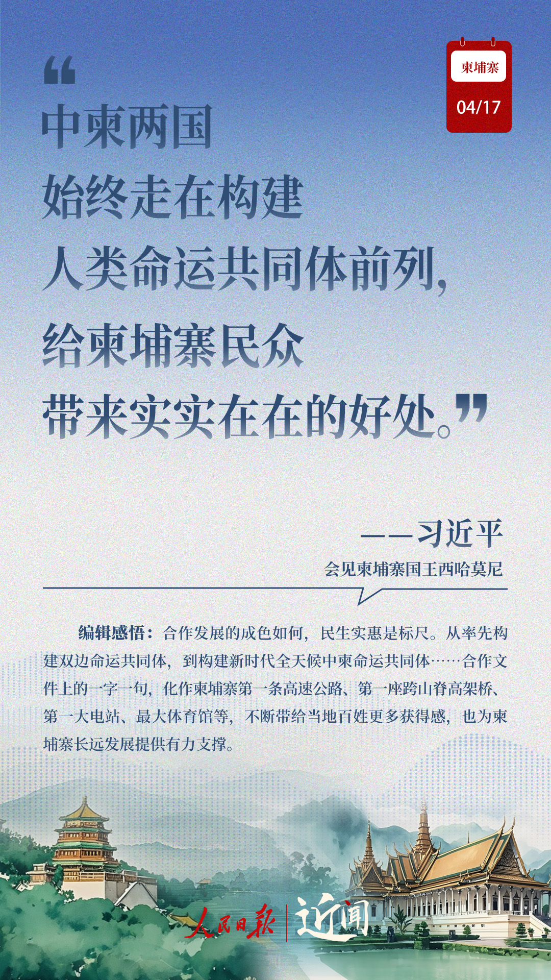 “古交如真金,百煉色不回?!睆膬蓢?guó)老一輩領(lǐng)導(dǎo)人親手締造和培育兩國(guó)友好,到率先構(gòu)建雙邊命運(yùn)共同體,再到構(gòu)建新時(shí)代全天候中柬命運(yùn)共同體,中柬關(guān)系新定位水到渠成。
