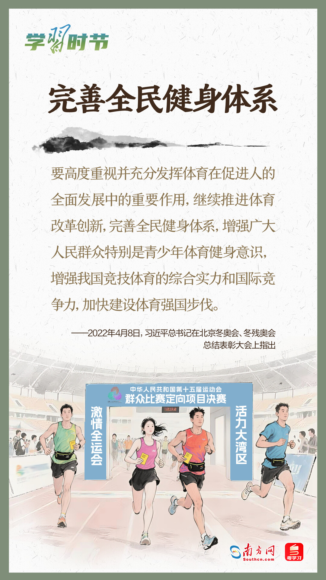 今年5月17日拉開帷幕的第十一屆全民營(yíng)養(yǎng)周,以“吃動(dòng)平衡 健康體重 全民行動(dòng)”為主題,向全社會(huì)傳遞運(yùn)動(dòng)和飲食在健康生活中同等重要的理念。而今年11月至12月由粵港澳三地共同承辦的十五運(yùn)會(huì)和殘?zhí)貖W會(huì),充分發(fā)揮賽事的“全民性”,將群眾體育發(fā)展推向新高度。
