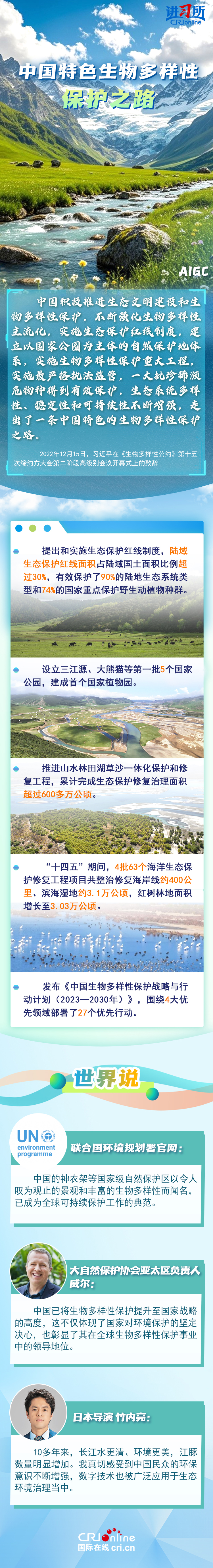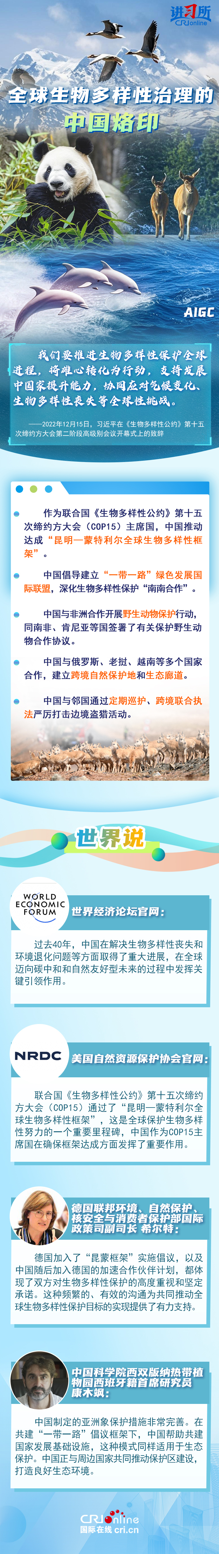 “心往一處想、勁往一處使,共建地球生命共同體?!弊鳛樽钤绾炇稹⑴鷾?zhǔn)《生物多樣性公約》的締約方之一,生物多樣性保護(hù)已經(jīng)上升為中國(guó)的國(guó)家發(fā)展戰(zhàn)略。國(guó)際人士表示,中國(guó)的一系列舉措體現(xiàn)出對(duì)生態(tài)環(huán)境保護(hù)的堅(jiān)定決心,同時(shí),中國(guó)依托共建“一帶一路”倡議等國(guó)際合作機(jī)制,為推動(dòng)全球生物多樣性保護(hù)提供了有力支持,在邁向自然友好型未來(lái)的過(guò)程中發(fā)揮關(guān)鍵的引領(lǐng)作用。