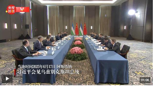 當(dāng)?shù)貢r(shí)間6月17日上午,國(guó)家主席習(xí)近平在阿斯塔納出席第二屆中國(guó)-中亞峰會(huì)期間會(huì)見烏茲別克斯坦總統(tǒng)米爾濟(jì)約耶夫。
