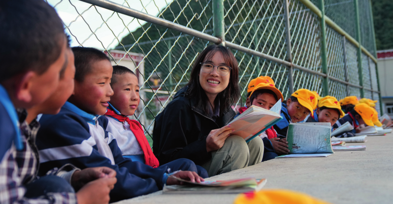 在西藏林芝市工布江達縣娘蒲鄉(xiāng)中心小學,嶺南師范學院支教隊隊員涂建枝在晚自習前和孩子們一起溫習功課(2024年9月3日攝)劉洲鵬攝/本刊
