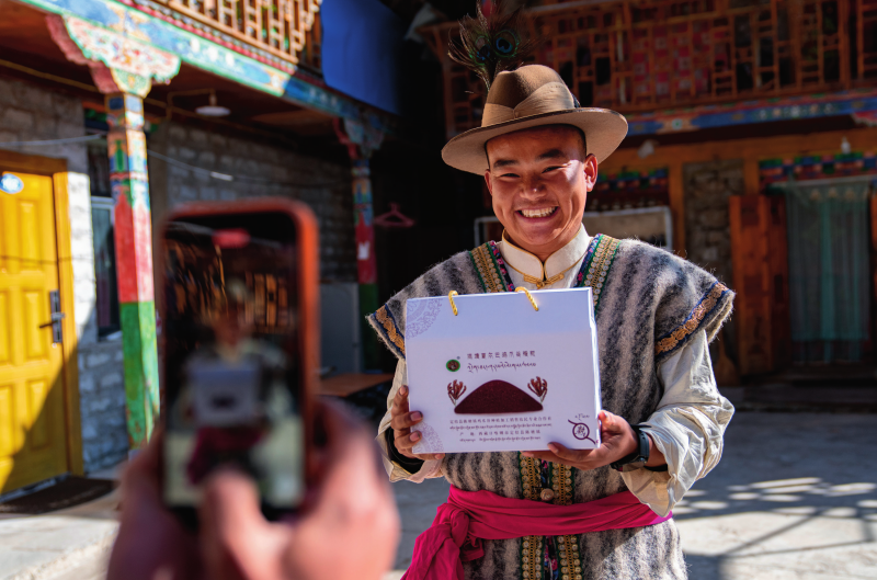 在西藏日喀則市定結縣陳塘鎮(zhèn),自媒體博主夏爾巴人旦增在拍攝視頻推介當?shù)靥禺a(chǎn)雞爪谷糌粑(2024年12月13日攝)丁增尼達攝/本刊