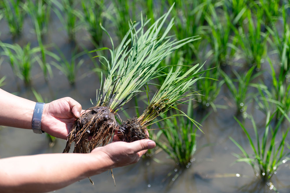 2025年6月18日,在黑龍江省雙鴨山市寶清縣一片水稻田旁,中國水稻研究所北方水稻研究中心科研人員查看應(yīng)用寒地水稻秸稈全量原位還田緩釋多效綜合技術(shù)的水稻(左)與普通水稻的長勢差別。該技術(shù)能夠有效減少化肥用量、提升土壤有機(jī)質(zhì)含量,節(jié)約成本、提產(chǎn)增效。