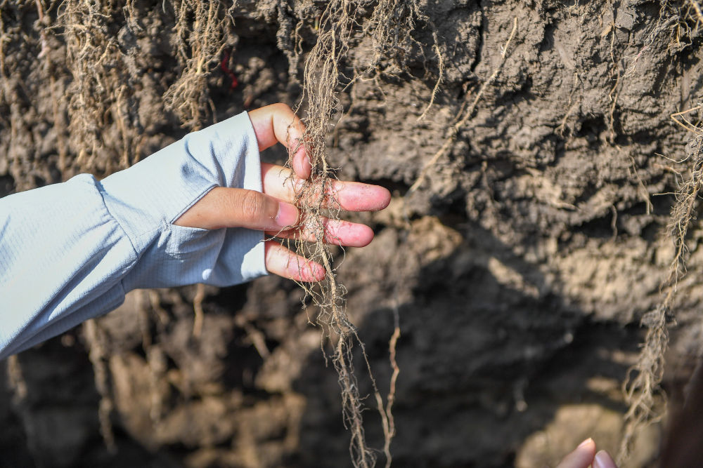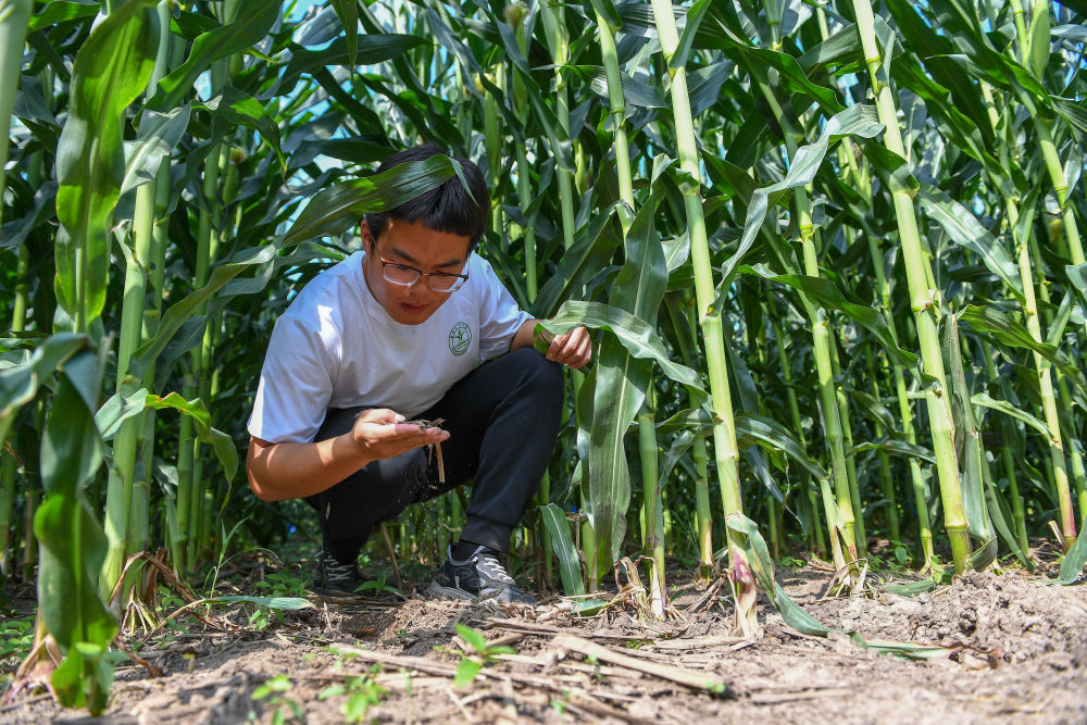 2023年7月31日,在位于吉林省四平市梨樹縣的中國農(nóng)業(yè)大學(xué)“科技小院”保護(hù)性耕作試驗田,一名學(xué)生查看玉米根部在黑土中的生長情況。