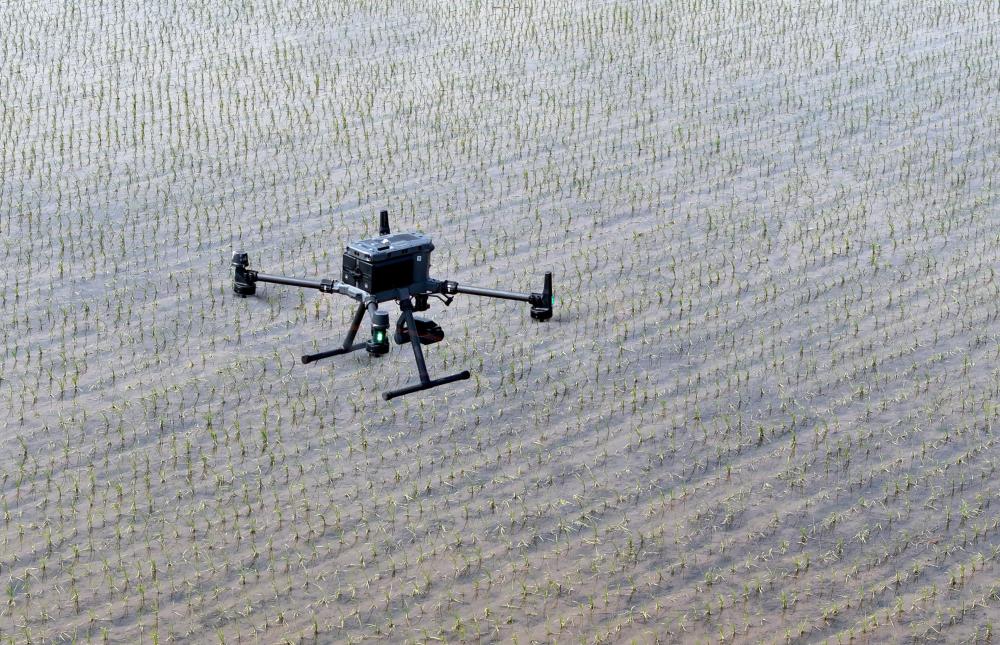 2025年5月21日,在黑龍江省北大荒農(nóng)業(yè)股份八五六分公司第六管理區(qū)農(nóng)業(yè)現(xiàn)代化示范區(qū),搭載多光譜、可見光攝像頭的無人機(jī)對水稻插秧后田塊進(jìn)行土壤墑情監(jiān)測(無人機(jī)照片)。