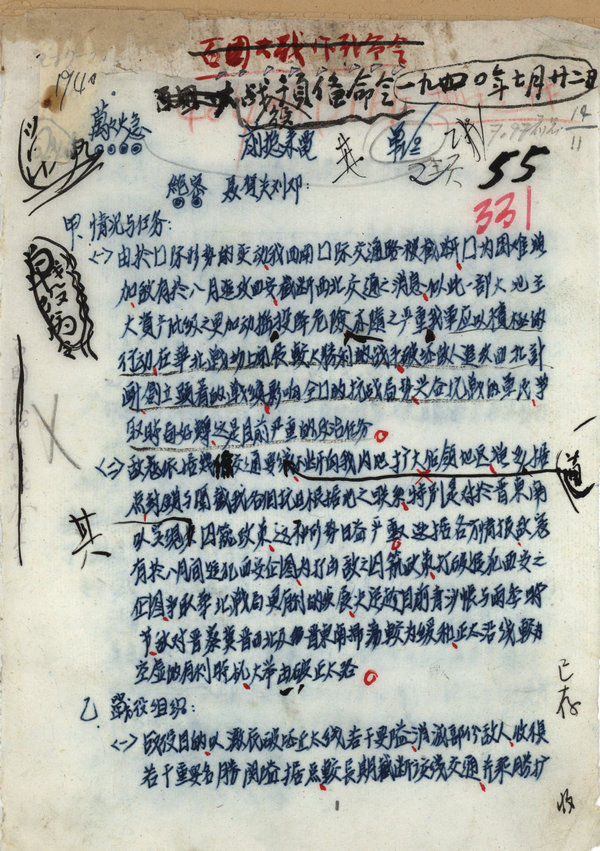 為粉碎侵華日軍的“囚籠政策”、遏制國民黨頑固派的妥協(xié)投降逆流,1940年8月至翌年1月,中國共產(chǎn)黨領導的八路軍在華北發(fā)動了百團大戰(zhàn)。百團大戰(zhàn)第一階段以破襲正太鐵路為重點,這是1940年7月22日簽發(fā)的破襲正太路戰(zhàn)役預備命令(中央檔案館提供)。