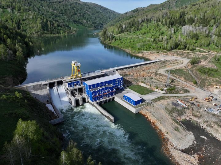 這是2025年5月8日在哈薩克斯坦東哈州拍攝的圖爾古孫水電站(無(wú)人機(jī)照片)。新華社記者 李任滋 攝